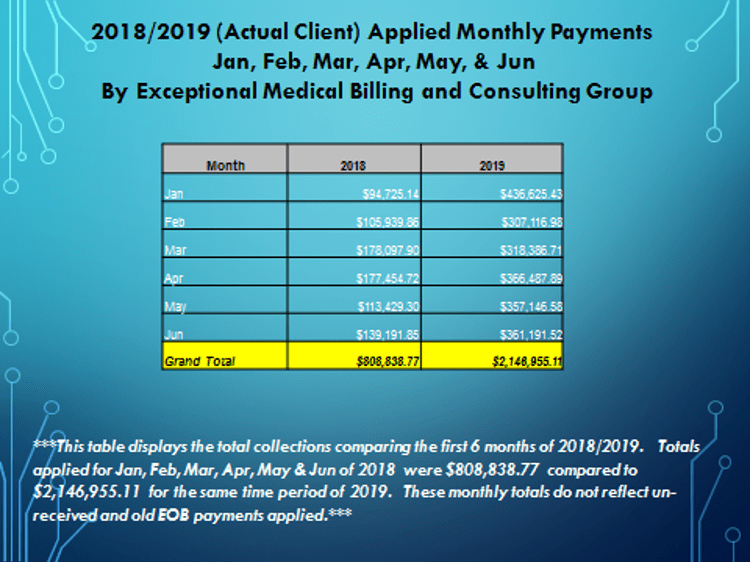 As a company that exclusively specializes in revenue cycle management services, Exceptional Medical Billing and Consulting Group is focused and committed to providing clear, useful data to its clients. EMBCG utilizes special designed algorithms and the best resources available to help its providers eliminate waste, improve efficiency, and maximize revenue. We don’t just forward automated reports. We thoroughly examine data, recognize patterns, and communicate strategies for improvement to our clients, on their preferred timetable.